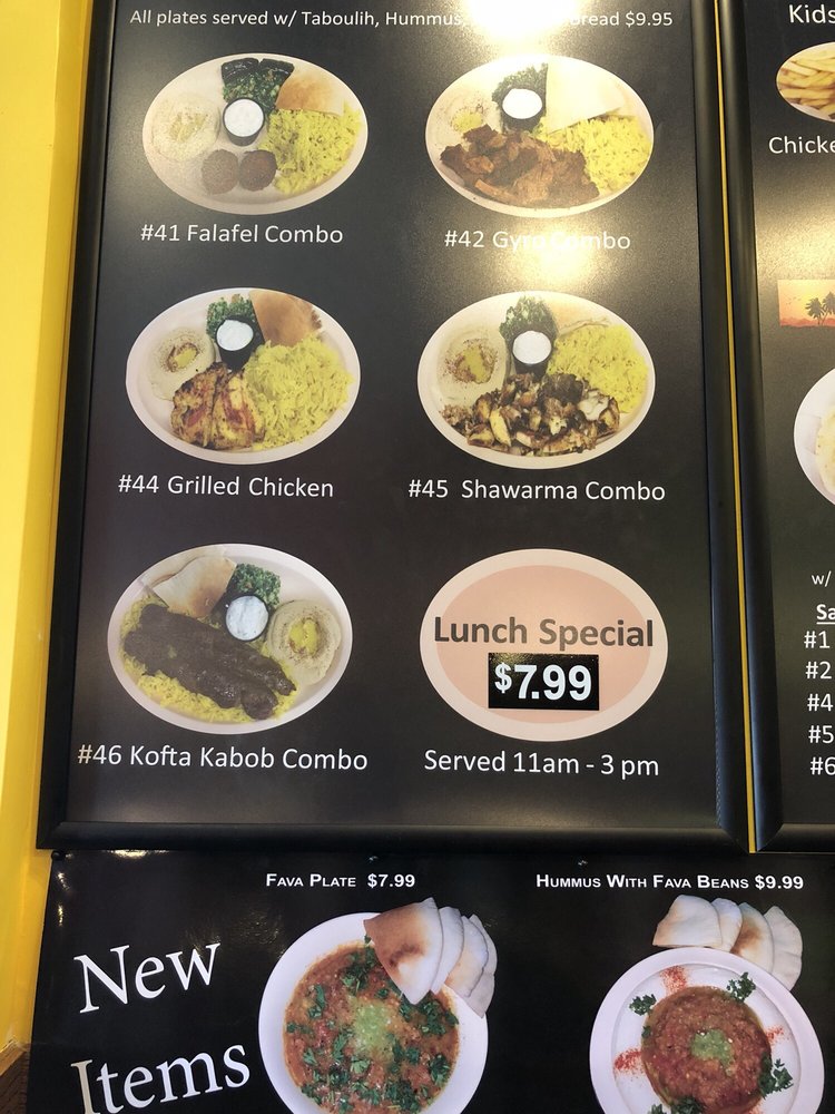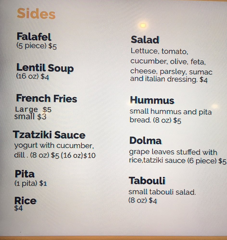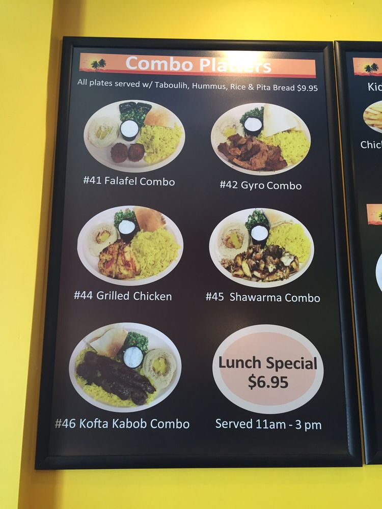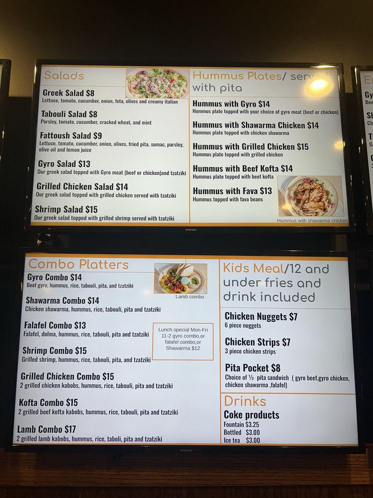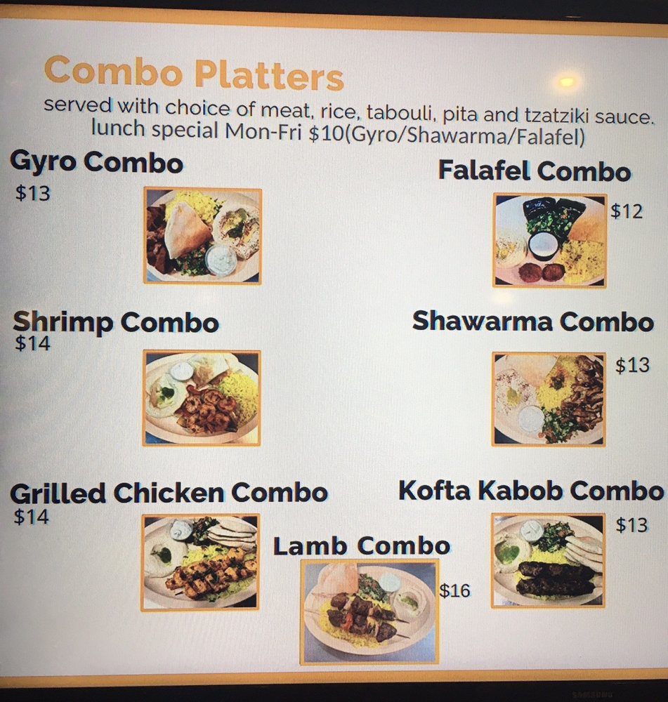 Your choice of beef or chicken gyro meat, rice, hummus, pita bread, tabouli salad, and tzatziki sauce.