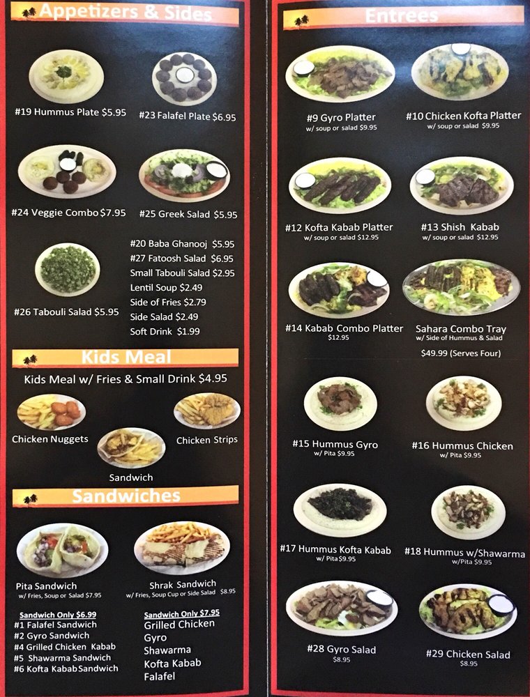 Sahara Mediterranean Food offers a diverse menu for Mediterranean cuisine enthusiasts. Located in Lees Summit, MO, this restaurant provides a variety of appetizers, salads, and sandwiches with options for vegetarians. The Veggie Combo Hummus, Baba Ghanoush, and Dolmas are popular starters, while the Gyro Salad and Chicken Gyro Sandwich are must-tries. Customers rave about the freshness of the food and the friendly service, making it a go-to spot for many. The flavorful dishes like falafel and baklava stand out, with reviewers praising the smooth hummus and perfectly spiced fries. If you're seeking a wholesome Mediterranean dining experience, Sahara Mediterranean Food is the place to visit.