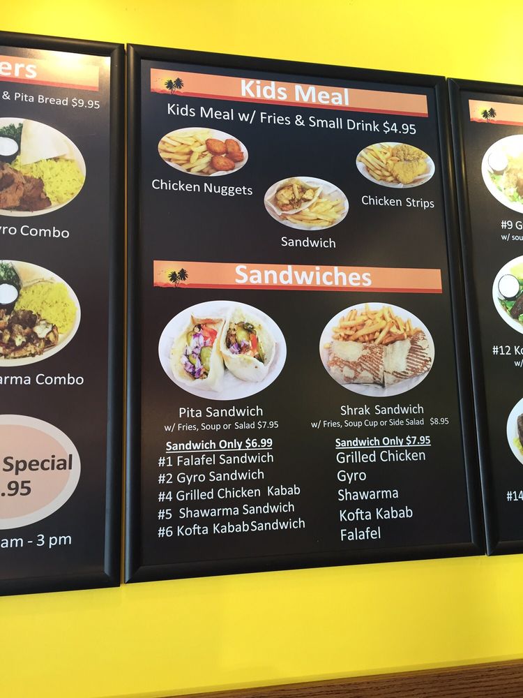 Shrak bread filled with beef gyro, grilled bell peppers, onions, cheese, and mayonnaise. Served with your choice of fries, soup, or salad. Shrak wrap sandwiches.