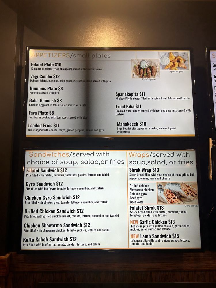 Shrak bread filled with falafel, hummus, tahini, pickles, tomato, cucumber, and lettuce. Served with your choice of fries, soup, or salad. Shrak wrap sandwiches.